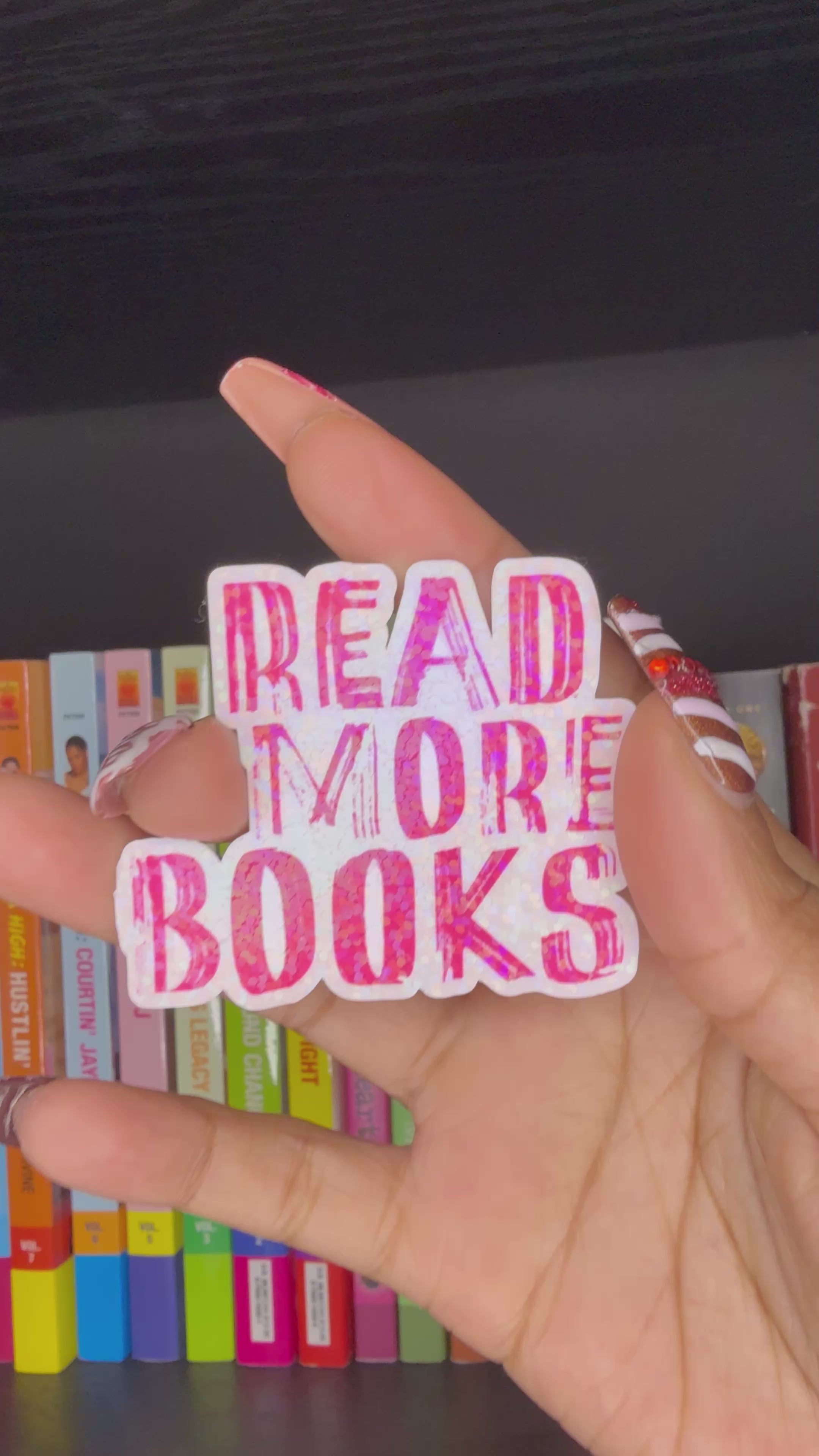 "Read More Books" vinyl waterproof sticker featuring holographic sparkles and original graphic design. Perfect for laptops, water bottles, e readers and more!