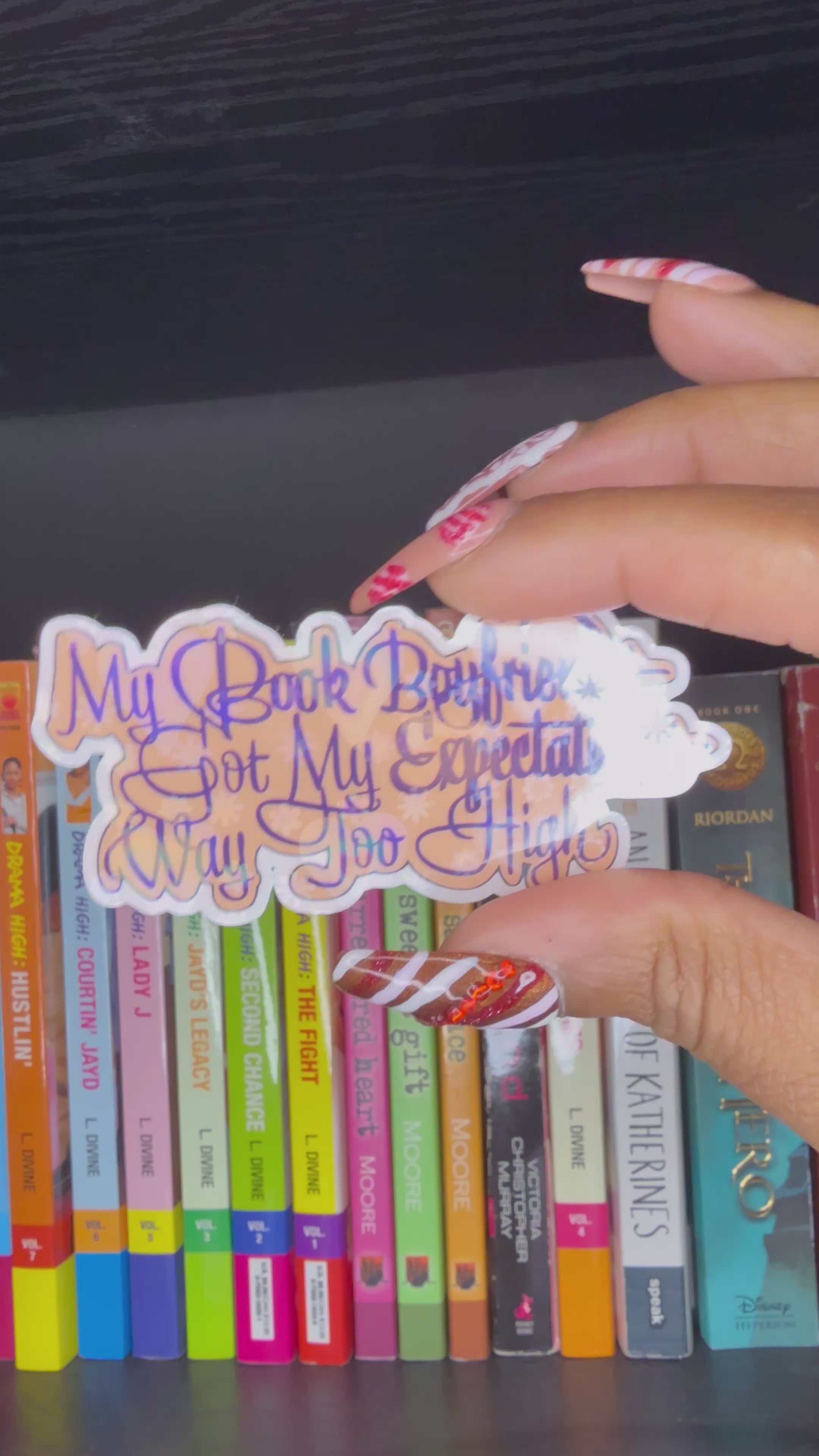 "My Book Boyfriends Got My Expectations Way Too High" vinyl waterproof sticker featuring holographic hearts and original graphic design. Perfect for laptops, water bottles, e readers and more!